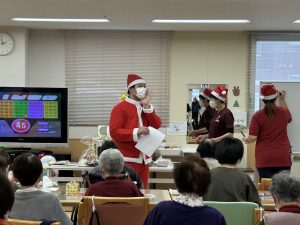 ゆあみーる 令和7年 ゆあみーる通所クリスマス会を開催しました! 12月11~12日にゆあみーる通所にてクリスマス会が行われました。 2日間にわたり行われた今回のクリスマス会は、 職員の手作り作品などが当たるビンゴ大会から始まり、 クリスマスソングを歌ったり、 ボランティアによる手品や歌謡ショーを楽しんだりと、 あっという間の催しとなりました。