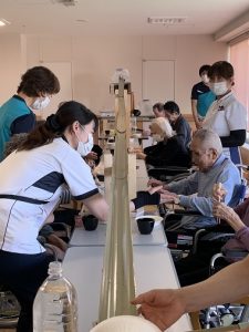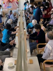 ゆあみーる 季節はずれの流しそーめん! 10/14にゆあみーる3Fにて、季節はずれの流しそーめんが行われました。 参加された方の「おいしいねー」という声が聞かれました。 なんと!とろみ食バージョンも用意されていました。